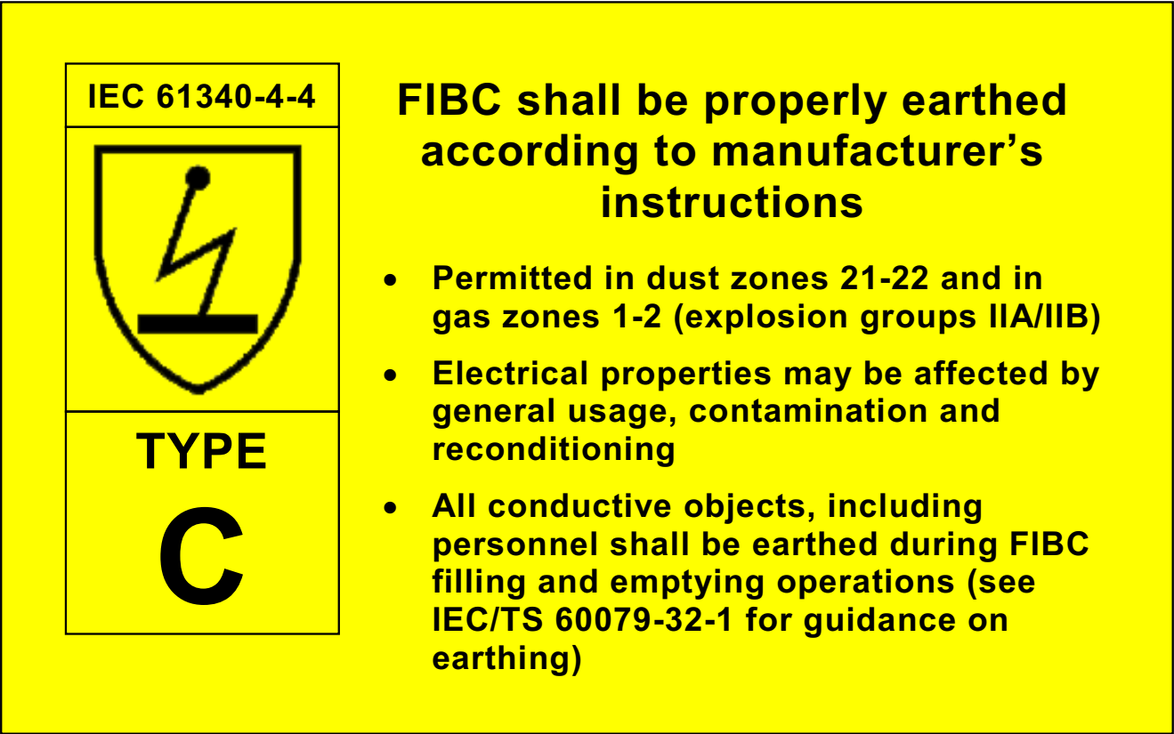 Säcke des Typs C und alle in ihre Konstruktion integrierten Innenauskleidungen sind für die Erdung vorgesehen. Auf diese Weise können elektrostatische Ladungen aus dem Sack abgeleitet werden, sodass die Gefahr einer zündfähigen Entladung aus dem Sack verringert wird. Typ-D-Säcke unterscheiden sich von Typ-C-Säcken dadurch, dass sie aus einem speziellen Material bestehen, das zündfähige elektrostatische Entladungen verhindert und daher keine Erdung erfordert. Weitere spezifische Anforderungen für die Verwendung von Typ-D-Säcken sind in der Norm beschrieben.