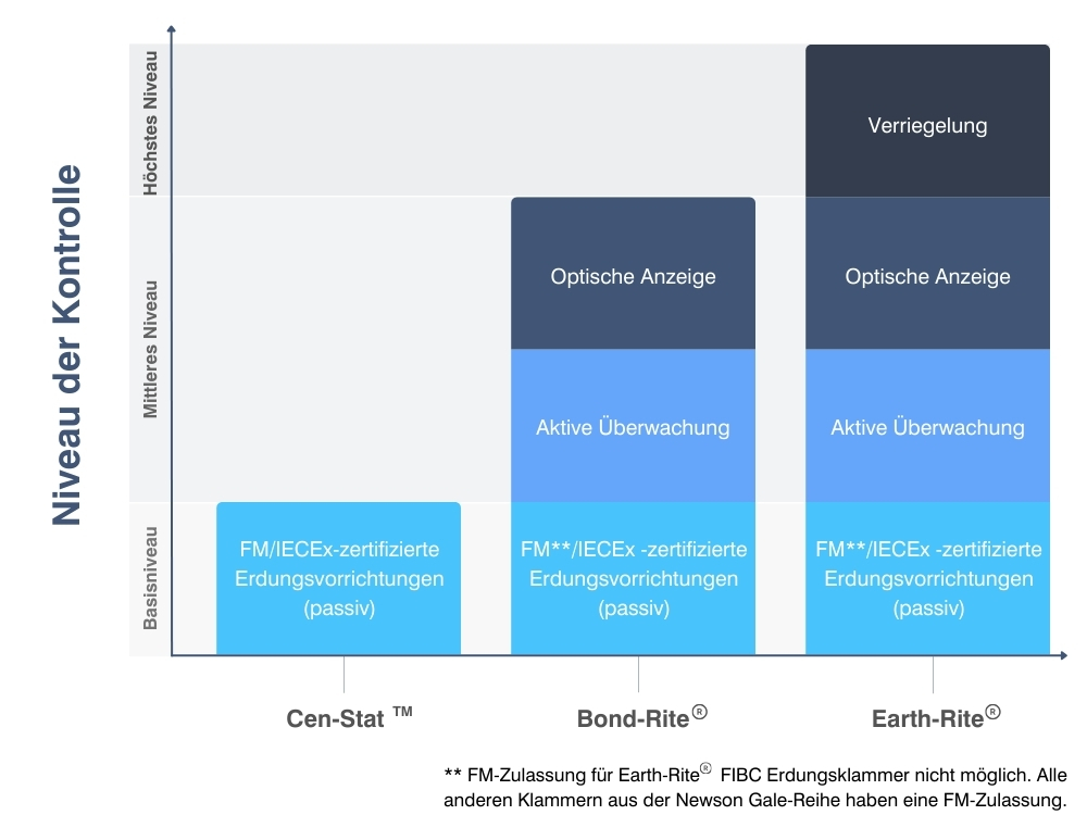 Die oben beschriebenen Methoden sind „aktive“ Lösungen. Sie stellen eine Anzeige-, Überwachungs- und Steuerungsebene dar, die den Bediener darüber informiert, ob eine Erdverbindung hergestellt wurde und für die Dauer des Materialumschlags aufrechterhalten wird.