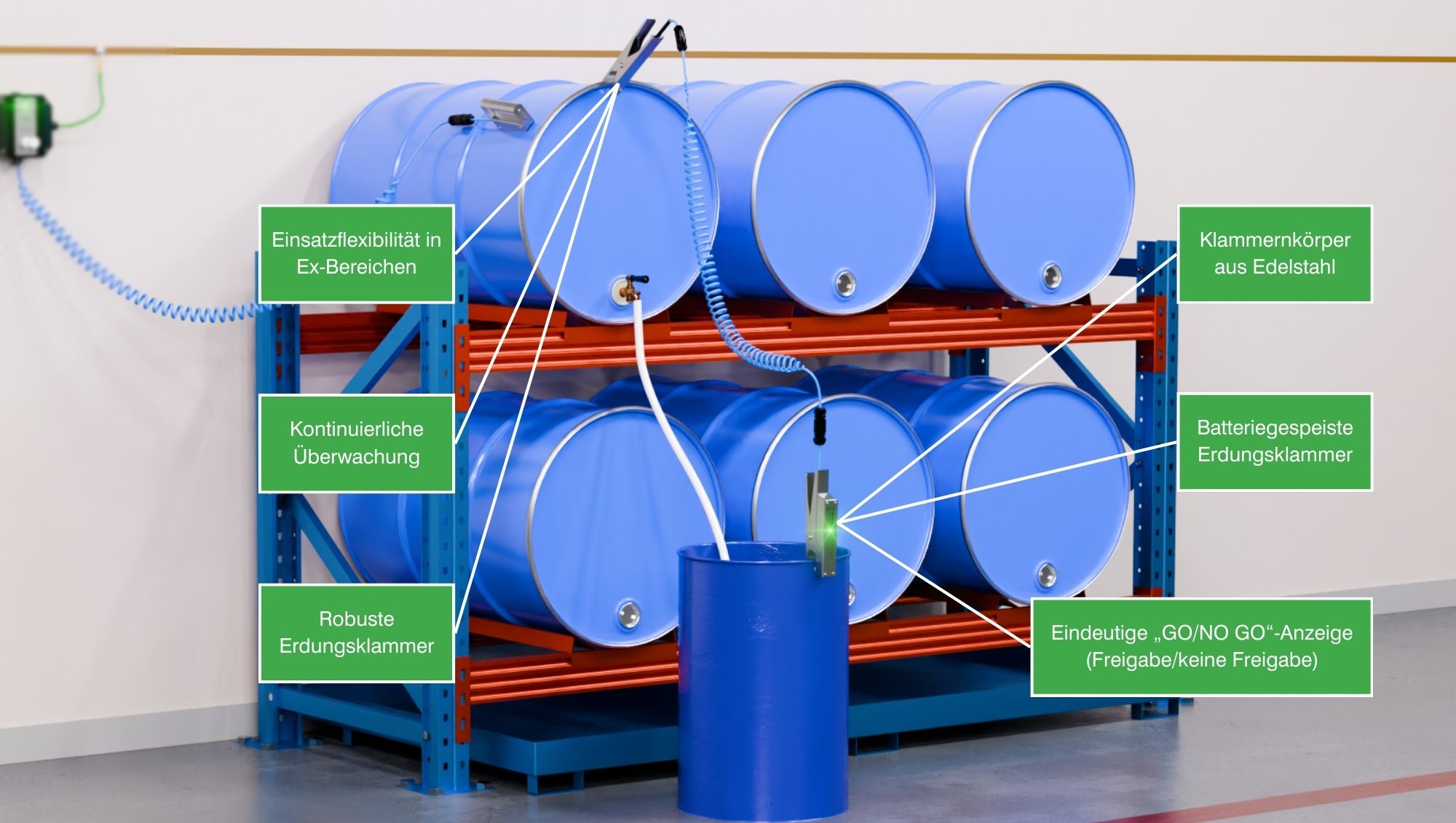 *Einrichtungen = Alle metallischen Prozesseinrichtungen, bei denen die Gefahr einer elektrostatischen Aufladung besteht (z. B. Metallfässer, Ex IBC, Tankfahrzeuge, Eimer, Kanister)