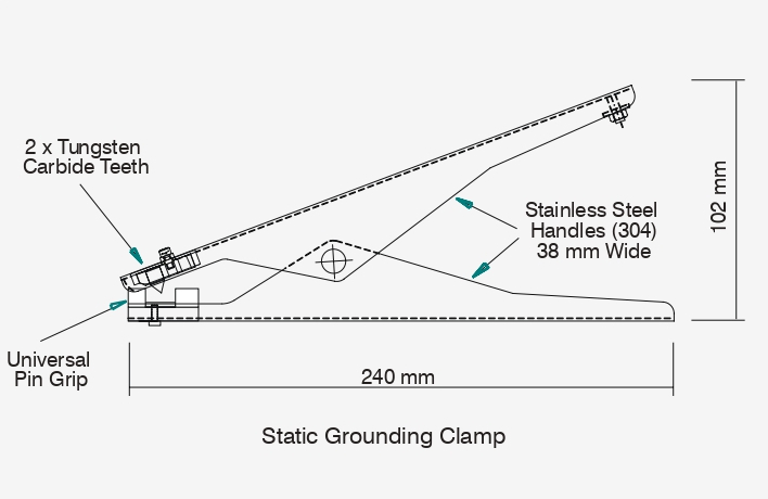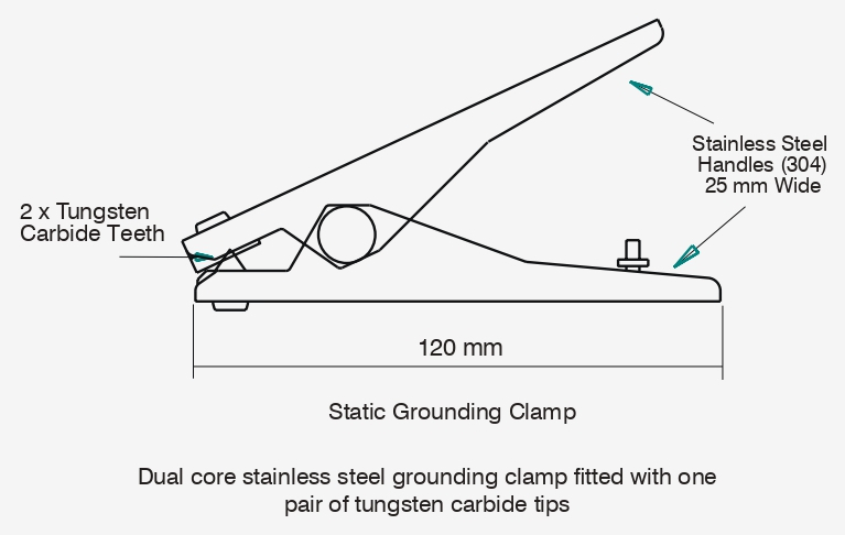 Eine robuste Edelstahlklammer mit scharfen Kontaktspitzen aus Wolframkarbid und einer starken Torsionsfeder stellt eine sichere Verbindung zum Kesselwagen her und hält diese während des gesamten Be- und Entladevorgangs.
